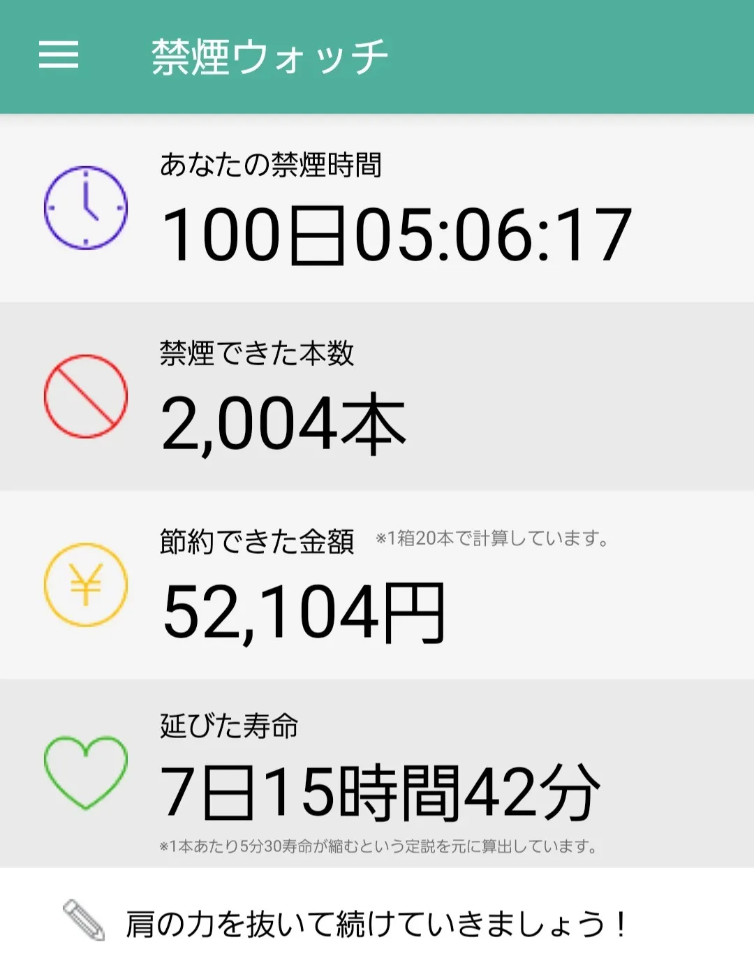 感想はと言えば、禁煙はことごとく利点だらけ!健康状態、金銭面、時間、周りの目線、仕事における集中力、どれにおいてもタバコを吸わない方が善いですね、、当たり前なのですが…笑